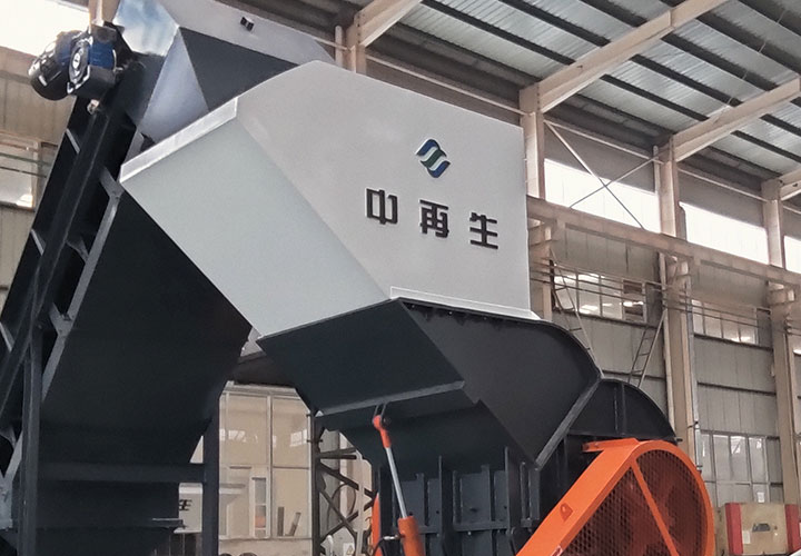 破碎線主機(jī)殼體采用特厚鋼板制造,內(nèi)襯為高錳鑄鋼件,可更換;主機(jī)轉(zhuǎn)子盤安裝于水平軸上,轉(zhuǎn)子盤圓周分布有銷軸,軸向懸有錘頭;主軸用滾珠軸承支撐,循環(huán)油強(qiáng)制潤滑冷卻,并裝有溫度傳感器;進(jìn)料口裝有液壓輥筒喂料裝置,位置一高一低,同向旋轉(zhuǎn),能將大件松散物料壓扁,送入破碎腔內(nèi)。